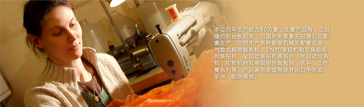 工業(yè)縫紉機(jī)臺(tái)板機(jī)架,與國(guó)外多家著名品牌公司配套生產(chǎn);同時(shí)生產(chǎn)各種服裝機(jī)械及配套設(shè)施,氣墊式鋼帶裁布機(jī),ZN90裝鈕機(jī)和雙保險(xiǎn)系列裝鈕機(jī)、全自動(dòng)裝鈕機(jī)等系列,半自動(dòng)拉布機(jī),拉布機(jī)臺(tái)及高級(jí)組合裁剪臺(tái),衣斗,工作凳系列等,產(chǎn)品遍布全國(guó)各地并出口中東亞、非洲、歐洲等地。